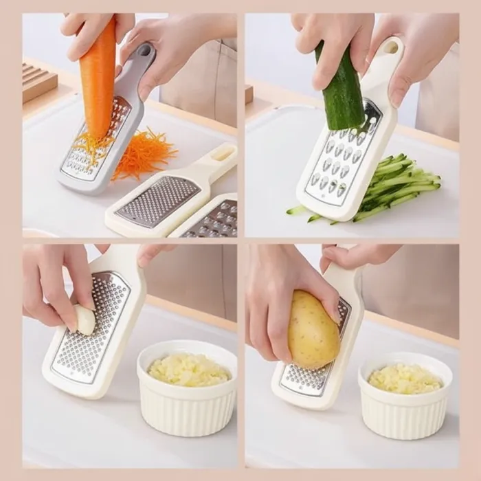 The 3-in-1 Multifunctional Vegetable Grater is a versatile kitchen tool designed to simplify food preparation. It features three interchangeable blades: a standard peeler, a slicer, and a julienne cutter, allowing you to peel, slice, and julienne fruits and vegetables with ease. The ergonomic, non-slip handle ensures a comfortable grip, making it suitable for both left and right-handed users. Whether you're preparing salads, garnishes, or other dishes, this grater is an essential addition to your kitchen toolkit.