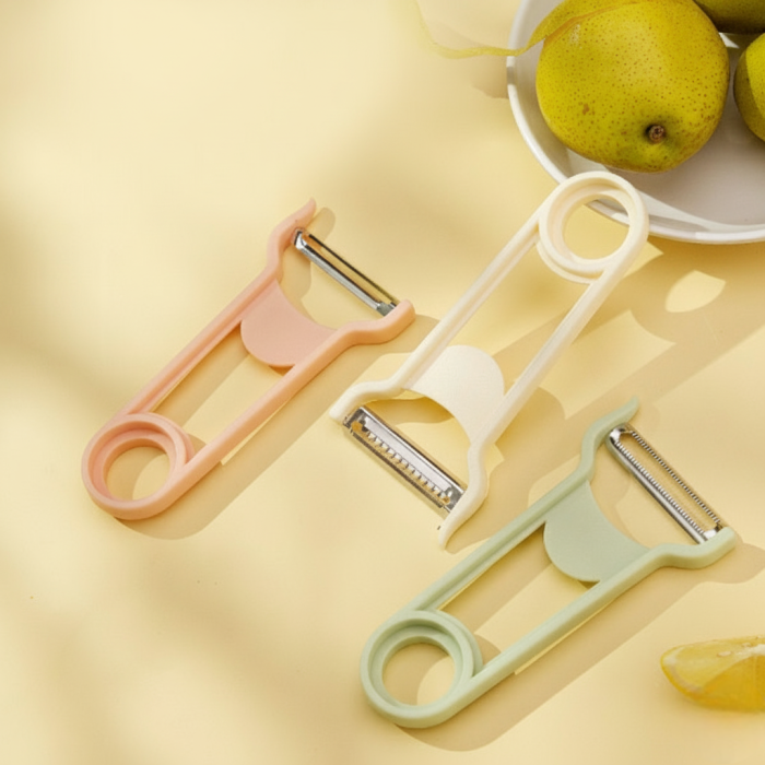 The 3-in-1 Stainless Steel Vegetable Peeler is a versatile kitchen tool designed to simplify food preparation. It features three interchangeable blades: a standard peeler, a slicer, and a julienne cutter, allowing you to peel, slice, and julienne fruits and vegetables with ease. The ergonomic, non-slip handle ensures a comfortable grip, making it suitable for both left and right-handed users. Whether you're preparing salads, garnishes, or other dishes, this peeler is an essential addition to your kitchen toolkit.
