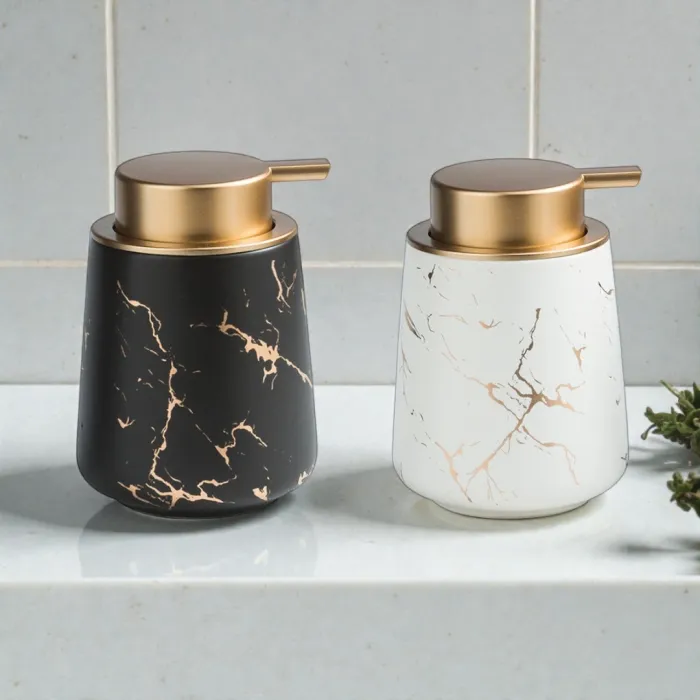 This high-grade ceramic press lotion bottle features a modern marble finish that adds a premium look to any bathroom or kitchen. Designed with a smooth press pump, it is suitable for dispensing hand soap, body soap, shampoo, or lotion. The refillable and reusable design makes it ideal for home and hotel use while helping maintain a clean and organized countertop. Available in marble black and marble white color options.