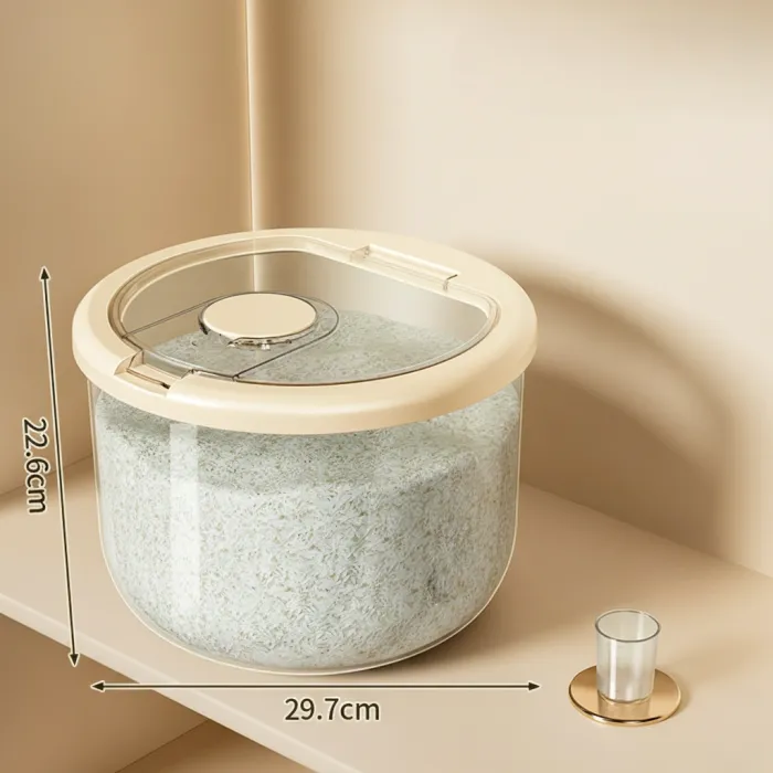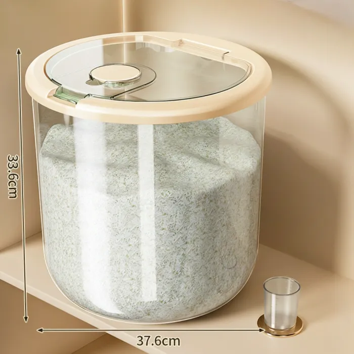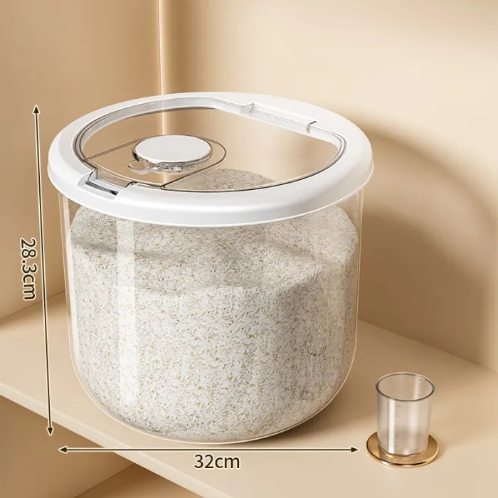 This food-grade airtight rice storage container is designed for safe and hygienic food storage at home. The sealed lid helps protect rice and dry food from insects, moisture, and external contamination. Its transparent white body allows easy monitoring of food quantity without opening the lid.