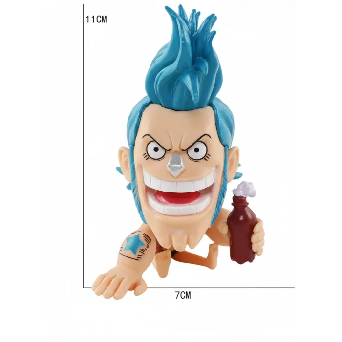 The One Piece Q-Version Sitting Franky Anime Figure features a playful chibi design with bright colors and strong detailing. Constructed from quality PVC material, it is durable and suitable for long-term display.