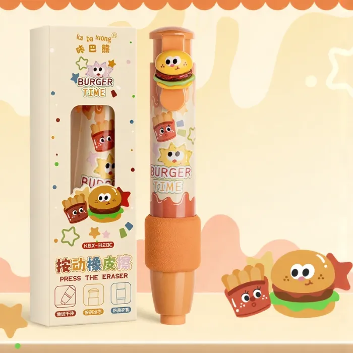 The Snack Language Press Eraser combines functionality with a fun snack-themed cartoon design. Its upgraded sponge sheath efficiently removes pencil marks without tearing paper or leaving smudges. A practical and charming addition to every student’s stationery set for homework and classroom use.