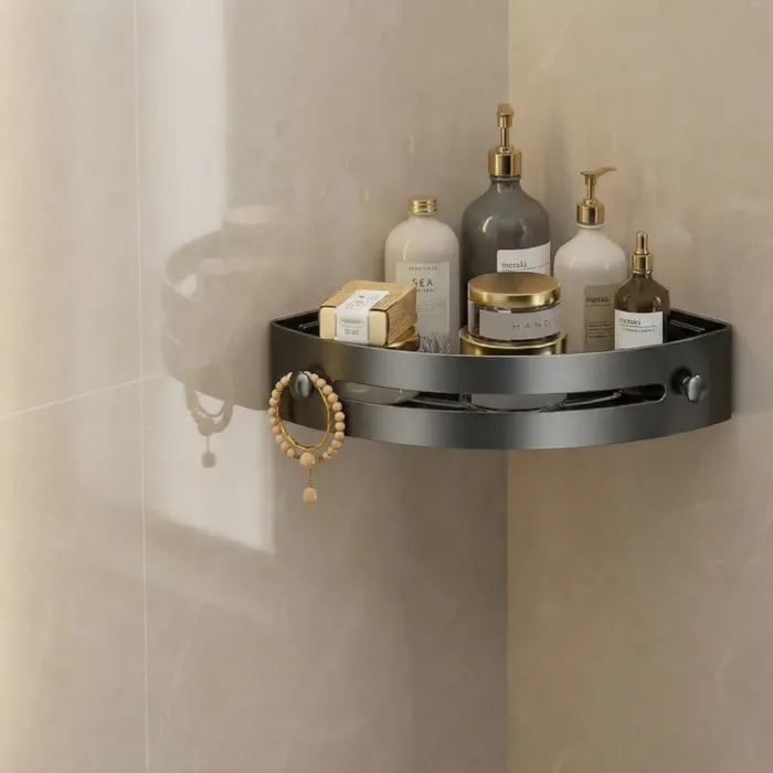 Maximize your space with this no‑drill, wall-mounted corner shelf — perfect for bathrooms, toilets, washstands, or kitchens
