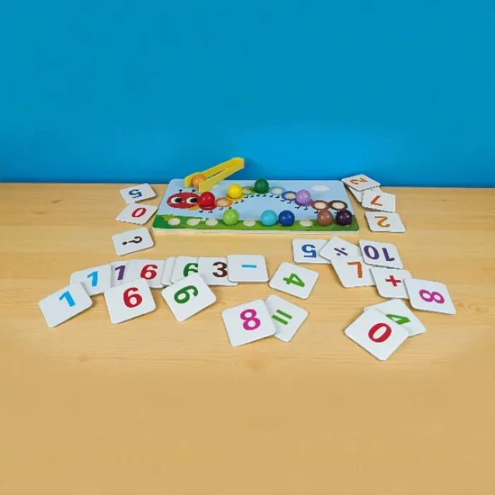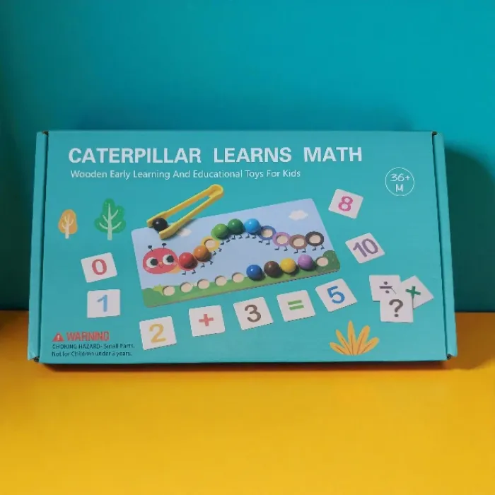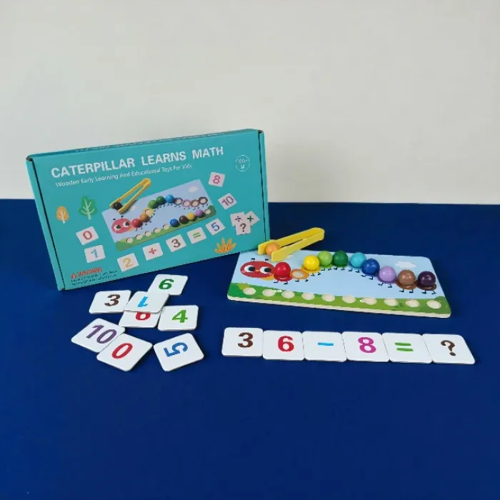 Designed with Montessori principles in mind, this toy features a wooden caterpillar board with colorful segments and matching beads, allowing children to physically manipulate objects to count, add, or subtract